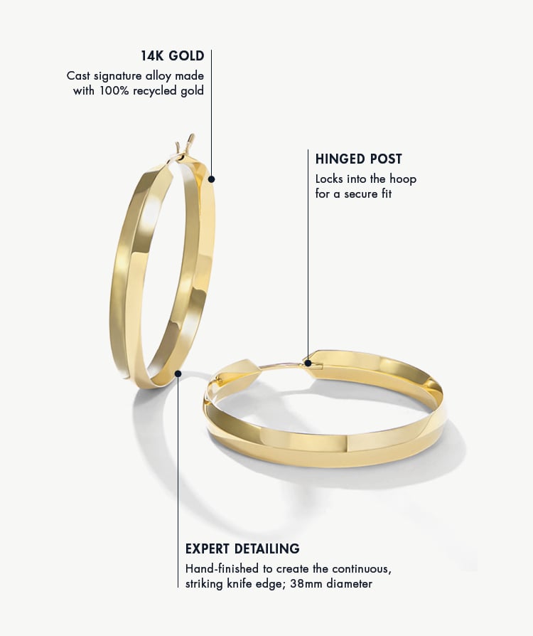 Designer Alice Cicolini's Major Defiant Hoop is a hoop that elevates the very idea of a hoop. With its striking silhouette and comfortable weight, it's a hoop with an edge. A hand-finished knife edge, to be exact.