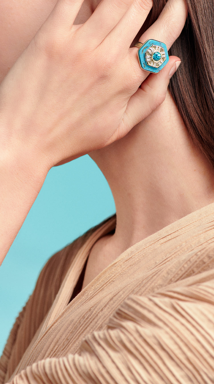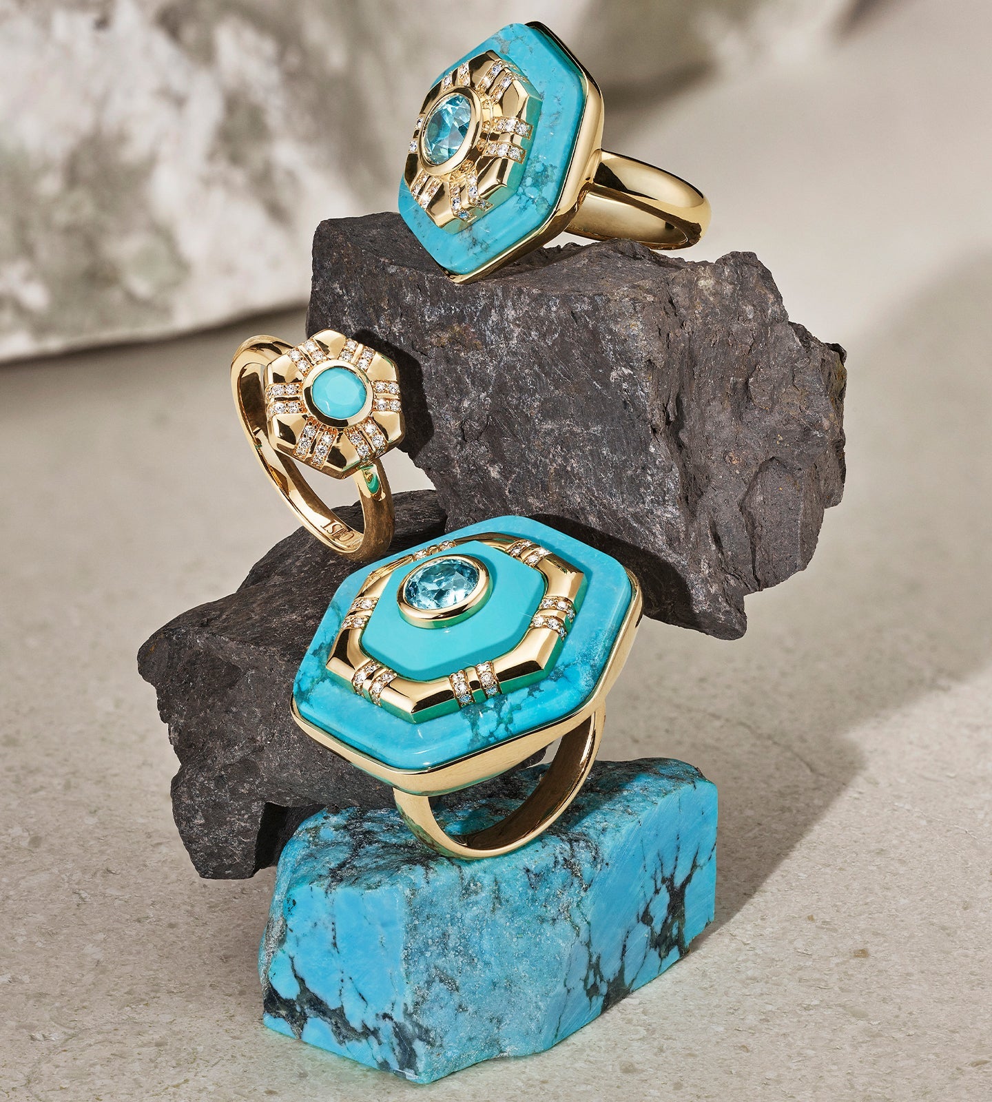 Turquoise is a powerful stone of balance, known for its ability to captivate and calm. Paired with diamonds and glittering gold in Earth’s most sacred shape, it’s the official talisman of the cool and collected.